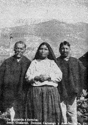 Jesús Gualavisí, Dolores Cacuango, y Amadeo Alba, 1941 Fuente: Domingo Paredes, ed., Los comunistas en la historia nacional (Guayaquil: Editorial Claridad, S.A., 1987), 156. |
